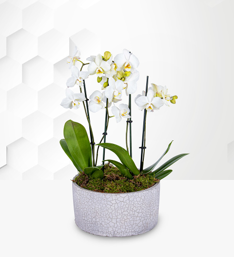 Introducing our stunning new Luxury Orchid plant in a beautiful crackle pot providing a sophisticated look to any home, ideal for a dining room or lounge. This stunning Orchid is very easy to care for if treated right and will flower all year round. These hard wearing plants require water regularly but make sure not to over water while making sure the roots do not dry out, during summer periods mist the plant with water lightly and keep in a bright sunny spot.