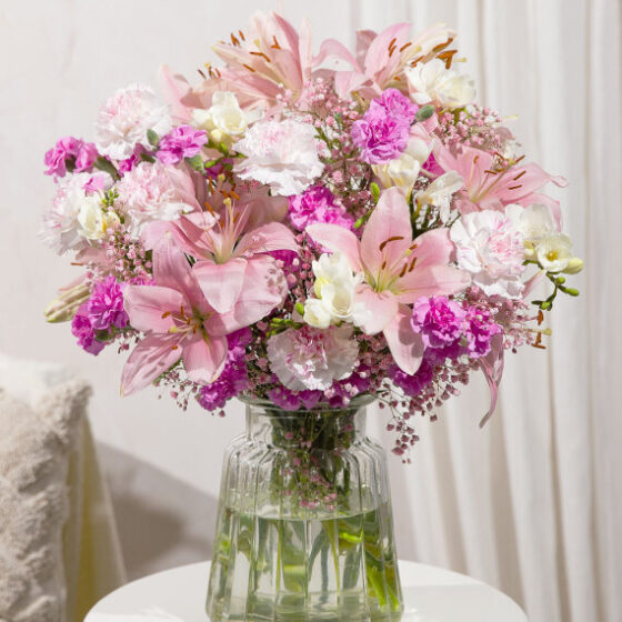 A delicate mixture of pale pink Asiatic Lilies alongside Carnations and pure white Freesias. Finished with sweet pink Gypsophila, it will make a gorgeous gift to send for a special occasion, or even just because!