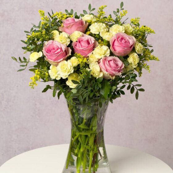 A classic bouquet featuring gorgeous pink Roses, pastel yellow Spray Carnations and Solidago with Parvi greenery. The perfect gift for any occasion.