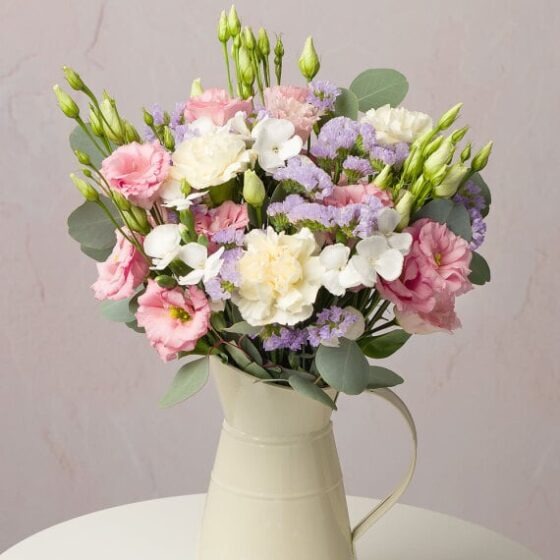 A dreamy collection of soft pastel blooms featuring delicate pink Snapdragon, white Carnations and elegant lavender Statice with Eucalyptus foliage. This bouquet is perfect for celebrating special moments or simply brightening someone’s day, this bouquet exudes grace and tranquillity.