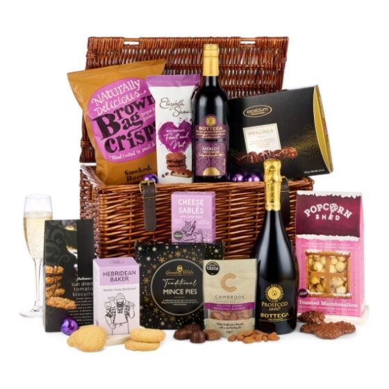 Indulge in Italian wines with premium chocolates, handmade biscuits and seasoned treats in our luxurious brown wicker basket. Expertly curated for sophisticated palates, this precious collection offers exceptional quality with elegant presentation worthy of special occasions. This hamper contains 10 items: Bottega Merlot 75cl Casa Bottega Prosecco DOC 75cl Hebridean Baker Heather Honey Shortbread 150g Popcorn Shed Toasted Marshmallow Gourmet Popcorn 80g Buiteman Sun Dried Tomato Biscuits 75g Grandma Wilds 4 Traditional Mince Pies Elizabeth Shaw Fruit & Nut Biscuits 140g Cambrook Hickory Smoke Seasoned Almonds 45g Excelcium Pralines 180g Brown Bag Smoked Bacon Crisps 150g Pea Green Boat Cheese Sables with Cumin Seeds 35g Packed in a brown wicker basket.