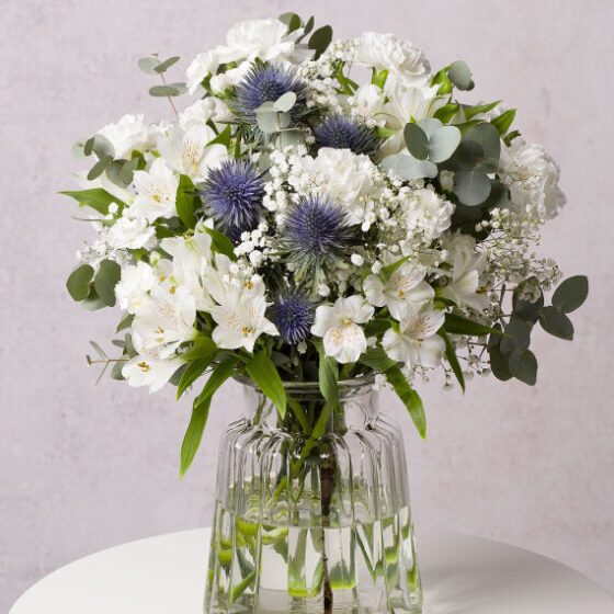 Capture the magic of a winter wonderland with this beautiful bouquet filled with winter white Carnations, Alstroemeria and striking blue Thistle. Paired with lush Eucalyptus and delicate Gypsophila, this bouquet brings the beauty of winter into the home.